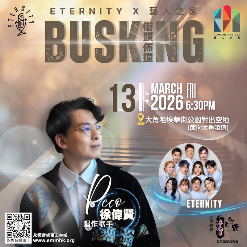 ETERNITY X 藝人之家BUSKING,今次請嚟歲月如歌作曲人及創作歌手徐偉賢,佢寫嘅好多歌你一定聽過 一齊喺街頭用音樂傳遞愛與盼望 地點:大角咀埃華街公園對出空地(面向大角咀道) 日期:3月13日 (五) 時間:6:30pm 如果想同我哋一齊傳福音!可以click下面link報名 https://forms.gle/Y5jpiH6QTGiUasSaA @homeofartistshk